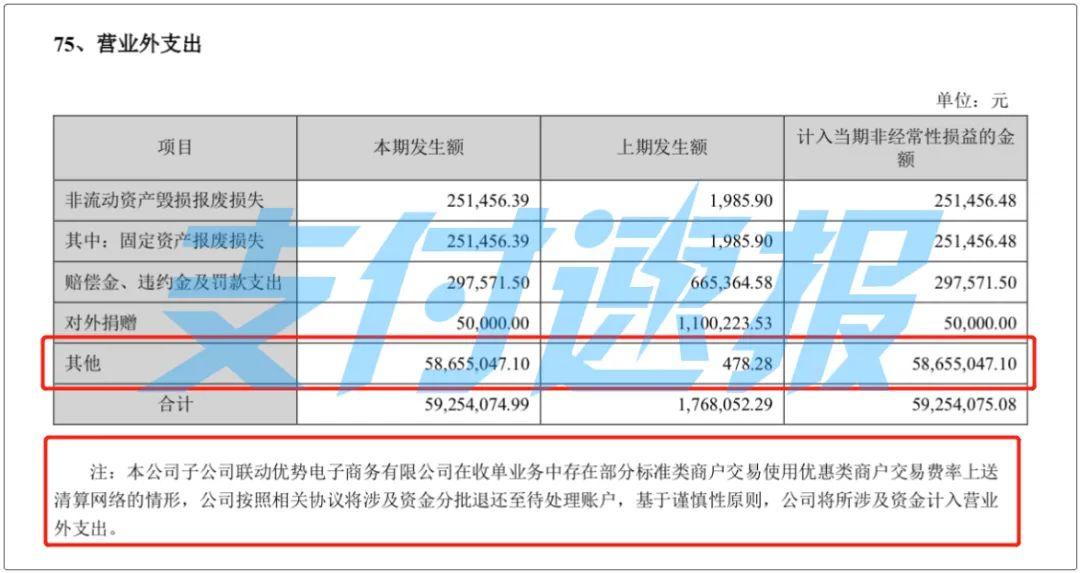 子公司聯動優勢在收單業務中存在部分標準類商戶交易使用商戶交易費率上送清算網絡的情形,公司按照相關協議將涉及資金分批退還至待處理賬戶,基于謹慎性原則,公司將所涉及資金計入營業外支出。公告中,營業外支出的其他金額為58,655,047.10元