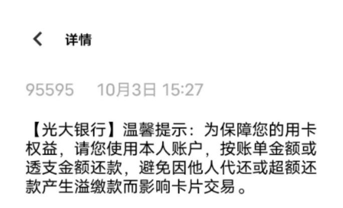 不少持卡人反映,最近幾天收到了銀行的短信提醒:請使用本人賬戶,按賬單金額或透支金額還款,避免他人代還或超額還款產生溢繳款而影響卡片交易。