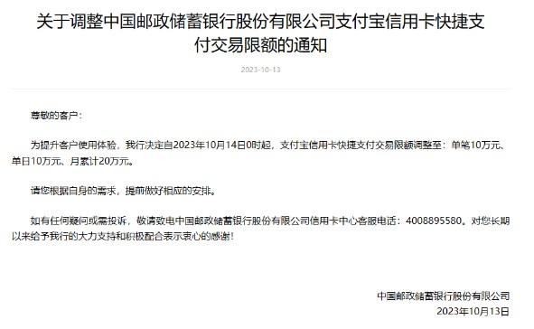 而郵政于第二天直接發布了調整支付寶信用卡快捷支付交易限額的通知: