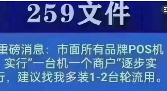 銀發【2021】259號文中要求:1臺銀行卡受理終端只能對應1個受理終端序列號即“一機一碼”;1臺銀行卡受理終端只能對應1個特約商戶即“一機一戶”.