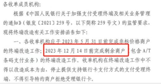 259號文中明確要求在2023年12月14日前完成剩余商戶的終端改造工作。各支付公司估計在12月14日后政策執行完。現在離規定時間越來越近,各支付公司也不會在風口的時候頂風作案,后續只會越來越合規。