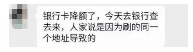 上周也同樣接到用戶反饋,自己的信用卡被降額了,打電話問發卡行客服,給出的答復是:總是在同一個地址消費,導致信用卡被降額。