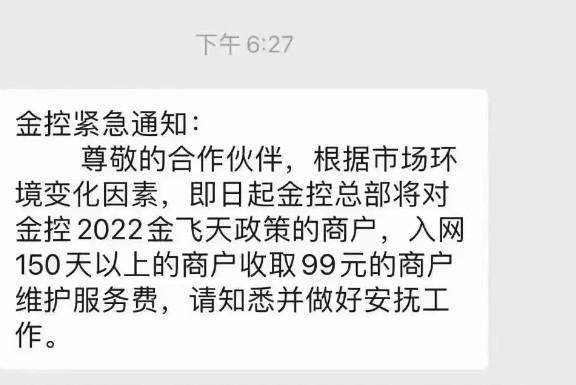 根據市場環境變化因素,即日起金控總部將對金控2022今飛天政策的商戶,入網150天以上的商戶收取99元的商戶維護服務費;