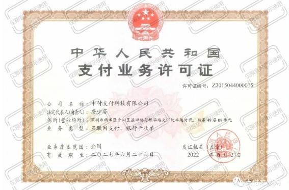 中付支付成立于2007年,并于2012年6月獲得人民銀行頒發的《支付業務許可證》,初期業務類型僅含有銀行卡收單許可,后在2014年7月份成功增項,目前業務范圍覆蓋全國的互聯網支付、銀行卡收單。