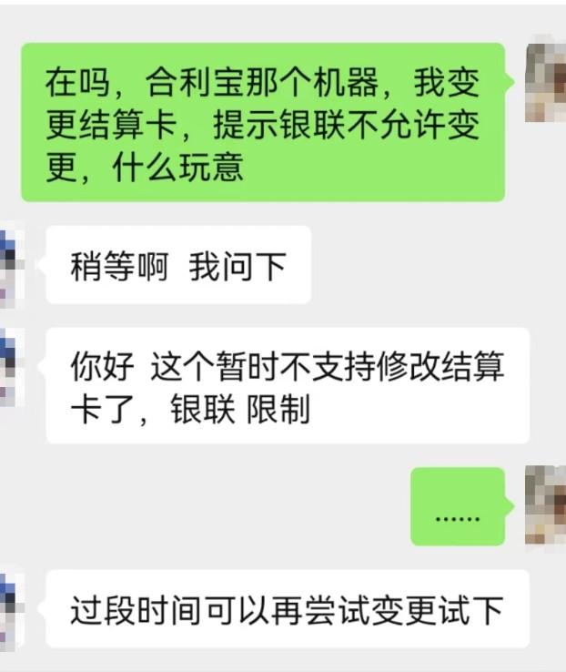 今天,有代理商向小編爆料,合利寶旗下POS產品,被銀聯限制,不允許變更結算卡。具體被限制多久目前未知,對接只回復過段時間可以嘗試變更。