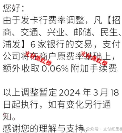 我確實(shí)也聽到了通道恢復(fù)的消息,不過聽說恢復(fù)的6家銀行要在原商戶費(fèi)率的基礎(chǔ)上額外收錢0.06%附加手續(xù)費(fèi)。