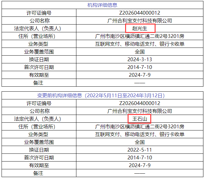 廣州合利寶支付科技有限公司法人王石山變更為趙光生
