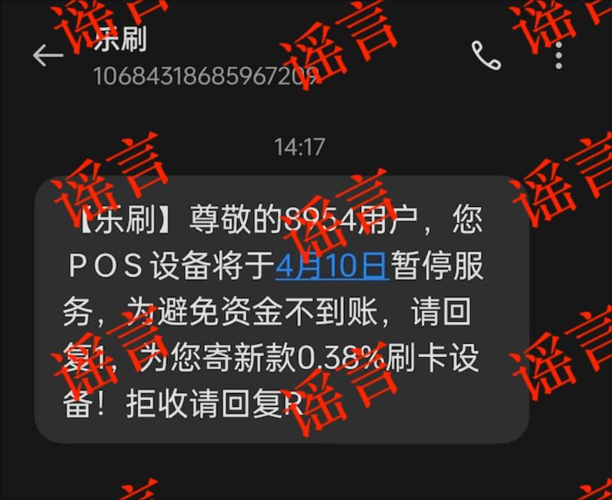聲明表示,近期收到用戶反饋,稱收到“設備暫停服務更換新款0.38%刷卡設備”的短信或電話通知,短信內容如下: