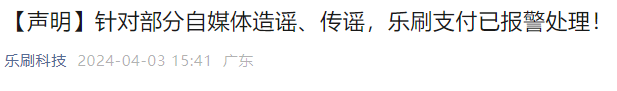 4月3日,樂刷發布聲明“針對部分自媒體造謠、傳謠,樂刷支付已報警處理!”