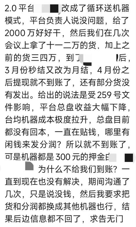 某2.0平臺分潤代理商提現不到賬,平臺負責人直接玩消失!據代理商描述:自2024年4月起到現在,代理的分潤提現一直都無法到賬。代理商自己前后拿貨約十五六萬。拿了十幾萬的貨,幾萬的分潤,一毛錢都沒拿到。