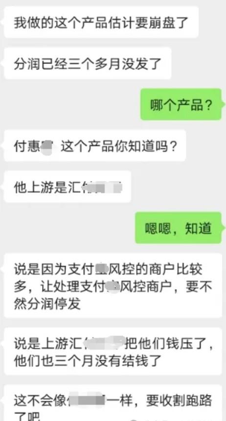 聚合碼牌產品付惠B分潤三個月沒發,提現不到賬!據爆料人描述:上級說因為風控商戶比較多,讓處理風控商戶,要不然分潤停發,說是上游支付公司已經扣壓了三個月分潤。