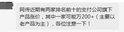 另外有業(yè)內(nèi)人士透漏,近期可能還會有兩家排名前十的支付公司旗下產(chǎn)品要漲價,其中一家可能漲至萬200以上!