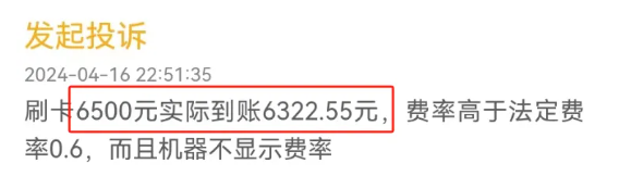 還有POS機漲價到萬200以上的機器,其他用戶爆料,有人刷6500,到賬6322.55,扣了177.45,費率相當(dāng)于萬270+3元/筆,也是天花板的級別。