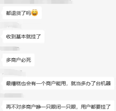 群內也有代理商表示,多商戶必死,客戶收到機器基本就掛了。