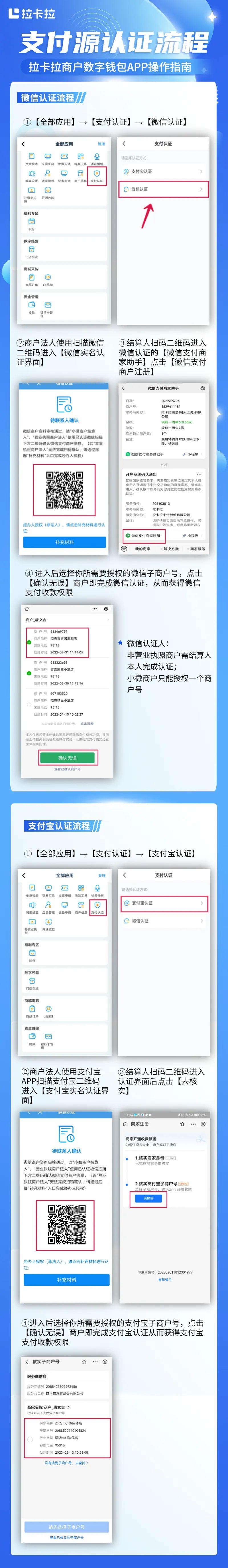 1.手機(jī)應(yīng)用商店下載《拉卡拉商戶(hù)數(shù)字錢(qián)包》2.用開(kāi)通時(shí)提供的手機(jī)號(hào)和證件登陸實(shí)名3.微信和支付寶認(rèn)證(簡(jiǎn)單,下方有圖示)收款-選擇下方保存二維碼至相冊(cè)記得每次收款更新生成新的二維碼