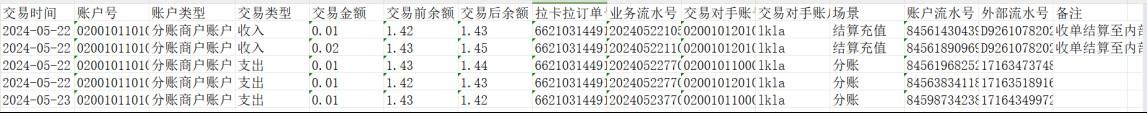 注:該菜單僅支持5月24日之后賬戶流水的查詢和導出,但不支持查詢之前的存量數據,存量數據仍需點擊賬戶流水菜單查詢。導出賬戶流水對賬單如下: