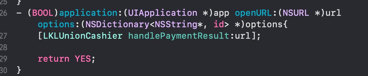 Appdelegate的openURL將支付結果url(如果之前有其他平臺,要區分開),傳給LKLUnionCashier