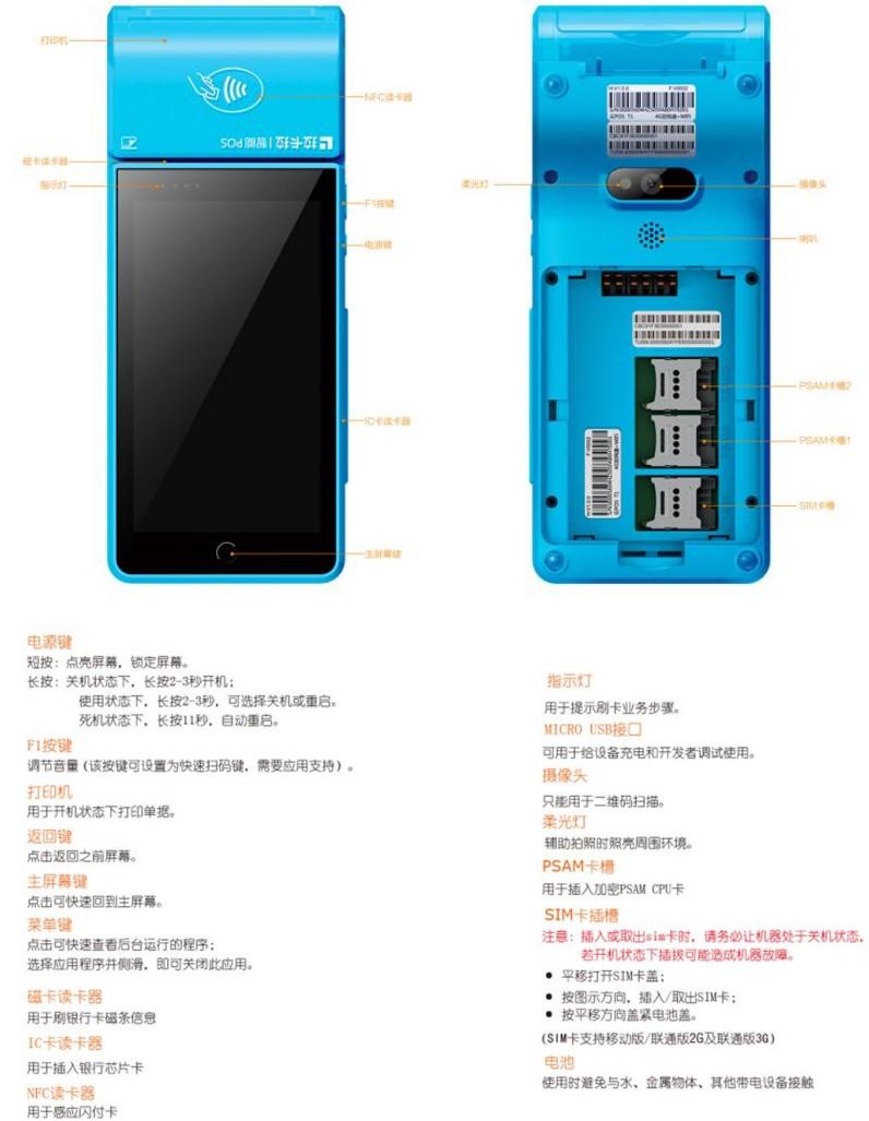 接口 | 1 個 Micro USB OTG, 1 個 SIM, 2 個 PSAM,1 個 Micro SD 卡槽,1 個耳機音頻接口 |